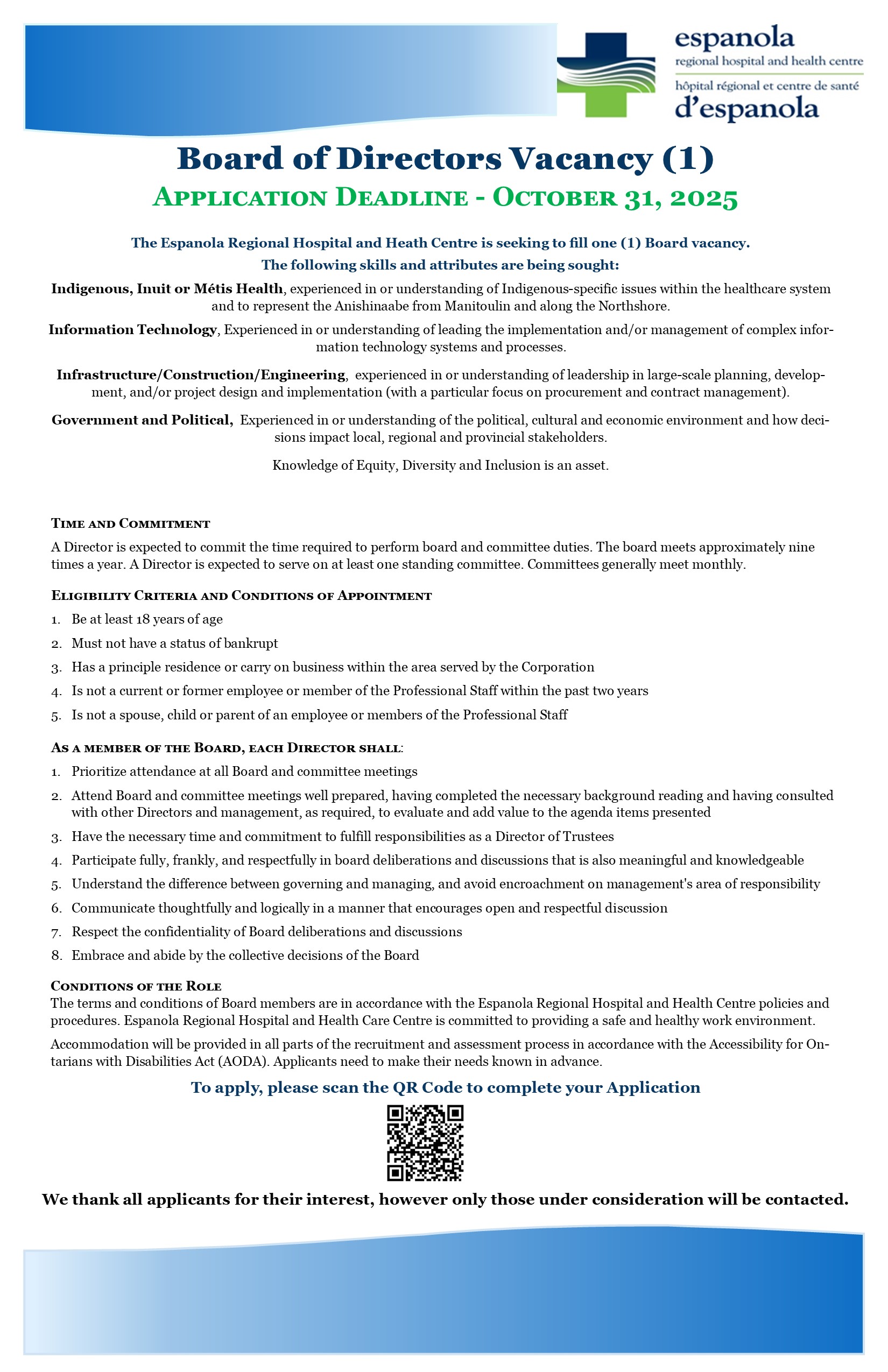 The Espanola Regional Hospital and Health Centre is an equal opportunity employer committed to inclusive, barrier-free recruitment and selection processes. If contacted for an employment opportunity, please advise if you require an accommodation.